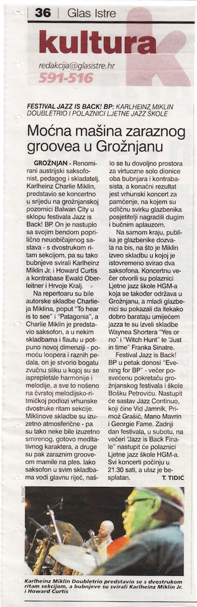 To complete the double trio instrumentation, Miklin brought a 'harmonizer' with him; an effect machine which transposes the signals of the saxophone to certain intervals, to create the effect of a horn ensemble. It was an unashamedly attractive sound when the saxophone fell into energy filled grooves and room-filling sounds. 'Junior' delivered some true solo battles with „professor“ Curtis and in most pieces a solo from each bassist was heard, and when there was the need for it, supporting measured fivefour bars with classic blues triplets.